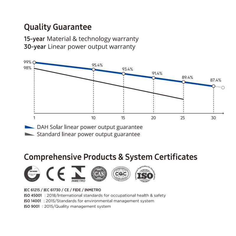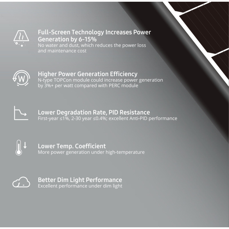 Špičkové bezrámové monokryštalické solárne panely s TOPCON technológiou DHM-T72X16/FS/BW) sa vďaka svojej konštrukcii pýši vysokou účinnosťou až 22,64%, mechanickým zaťažením až 5400 PA a zvýšenou odolnosťou voči teplotným výkyvom. Patentovaná bezrámová technológia zvyšuje dlhodobý výkon až o 15%.